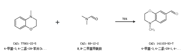 2.通过4-甲基-3,4-二氢-2H-苯并[b][1,4]噁嗪和N,N-二甲基甲酰胺合成4-甲基-3,4-二氢-2H-1,4-苯并噁嗪-7-甲醛,收率约76%;