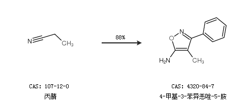 1.通过丙腈合成4-甲基-3-苯异恶唑-5-胺,收率约88%;