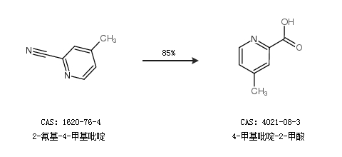 1.通过2-氰基-4-甲基吡啶合成4-甲基吡啶-2-甲酸,收率约85%;