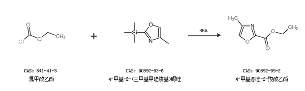 1.通过氯甲酸乙酯和4-甲基-2-(三甲基甲硅烷基)噁唑合成4-甲基恶唑-2-羧酸乙酯,收率约85%;
