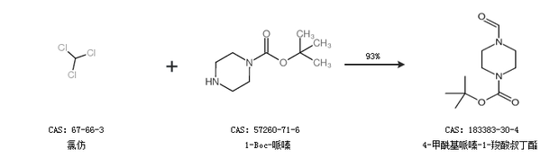 2.通过氯仿和1-Boc-哌嗪合成4-甲酰基哌嗪-1-羧酸叔丁酯,收率约93%;