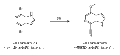 1.通过4,7-二溴-1H-吡咯并[2,3-c]吡啶合成4-甲氧基-1H-吡咯并[2,3-c]吡啶-7-甲腈,收率约25%;