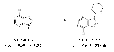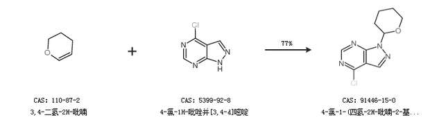 1.通过3,4-二氢-2H-吡喃和4-氯-1H-吡唑并[3,4-d]嘧啶合成4-氯-1-(四氢-2H-吡喃-2-基)-1H-吡唑并[3,4-d]嘧啶,收率约77%;