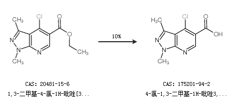 1.通过1,3-二甲基-4-氯-1H-吡唑[3,4-B]并吡啶-5-甲酸乙酯合成4-氯-1,3-二甲基-1H-吡唑3,4-吡啶-5-羧酸,收率约10%;