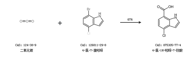 1.通过二氧化碳和4-氯-7-溴吲哚合成4-氯-1H-吲哚-7-羧酸,收率约67%;