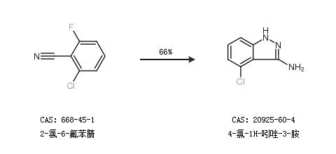 1.通过2-氯-6-氟苯腈合成4-氯-1H-吲唑-3-胺,收率约66%;