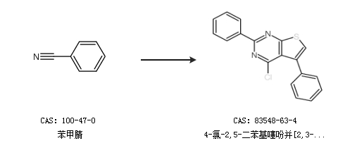 2.通过苯甲腈合成4-氯-2,5-二苯基噻吩并[2,3-d]嘧啶
