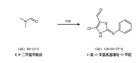 1.通过N,N-二甲基甲酰胺合成4-氯-2-苯基氨基噻唑-5-甲醛,收率约53%;