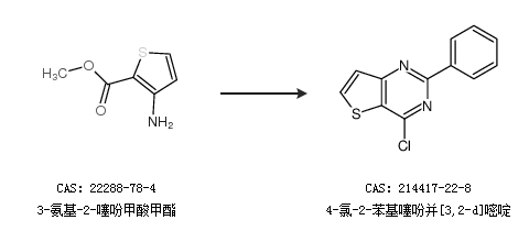 1.通过3-氨基-2-噻吩甲酸甲酯合成4-氯-2-苯基噻吩并[3,2-d]嘧啶