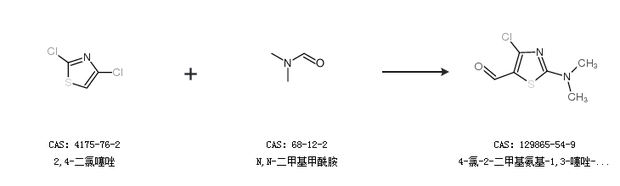 2.通过2,4-二氯噻唑和N,N-二甲基甲酰胺合成4-氯-2-二甲基氨基-1,3-噻唑-5-甲醛