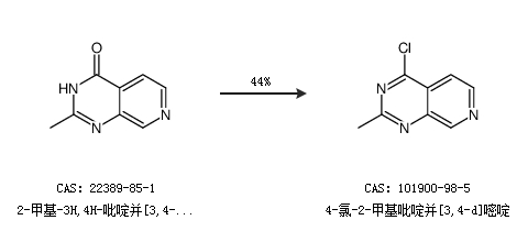 1.通过2-甲基-3H,4H-吡啶并[3,4-d]嘧啶-4-酮合成4-氯-2-甲基吡啶并[3,4-d]嘧啶,收率约44%;