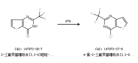 1.通过2-三氟甲基噻吩并[3,2-D]嘧啶-4(3H)-酮合成4-氯-2-三氟甲基噻吩并[3,2-D]嘧啶,收率约87%;