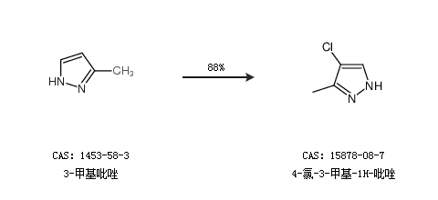 1.通过3-甲基吡唑合成4-氯-3-甲基-1H-吡唑,收率约88%;
