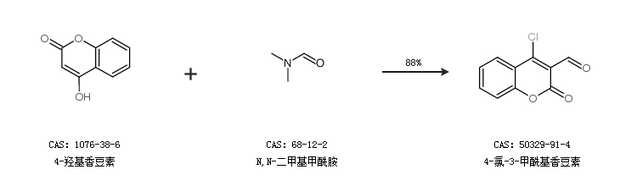 1.通过4-羟基香豆素和N,N-二甲基甲酰胺合成4-氯-3-甲酰基香豆素,收率约88%;