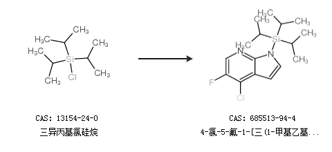 英文别名 4-chloro-5-fluoro-1-triisopropylsilanyl-7-azaindole;4-chloro-5-fluoro-1-(triisopropylsilyl)-1H-pyrrolo[2,3-b]pyridine;4-Chloro-5-fluoro-1-[tris(1-methylethyl)silyl]-1H-pyrrolo[2,3-b]pyridine;5-fluoro-4-chloro-1-triisopropylsilanyl-1H-pyrrolo[2,3-b]pyridine;