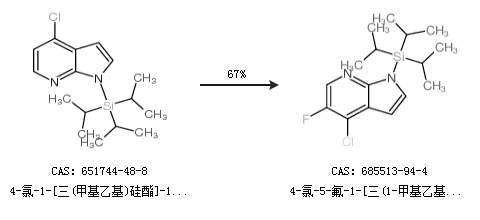 1.通过4-氯-1-[三(甲基乙基)硅酯]-1H-吡咯并[2,3-B]吡啶合成4-氯-5-氟-1-[三(1-甲基乙基)硅基]-1H-吡咯并[2,3-b]吡啶,收率约67%;