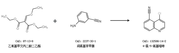 1.通过乙氧基甲叉丙二酸二乙酯和间氨基苯甲腈合成4-氯-5-氰基喹啉