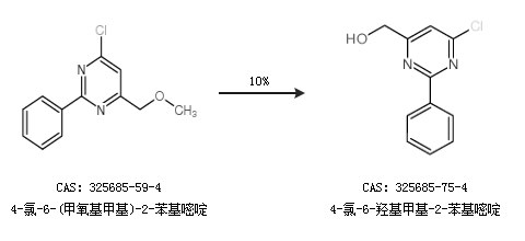 1.通过4-氯-6-(甲氧基甲基)-2-苯基嘧啶合成4-氯-6-羟基甲基-2-苯基嘧啶,收率约10%;