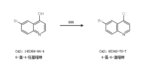 1.通过6-溴-4-羟基喹啉合成4-氯-6-溴喹啉,收率约99%;