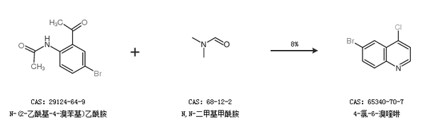 2.通过N-(2-乙酰基-4-溴苯基)乙酰胺和N,N-二甲基甲酰胺合成4-氯-6-溴喹啉,收率约8%;