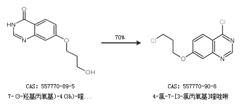 1.通过7-(3-羟基丙氧基)-4(3h)-喹唑啉酮合成4-氯-7-[3-氯丙氧基]喹唑啉,收率约70%;