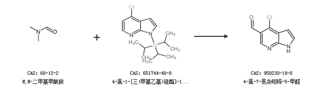 1.通过N,N-二甲基甲酰胺和4-氯-1-[三(甲基乙基)硅酯]-1H-吡咯并[2,3-B]吡啶合成4-氯-7-氮杂吲哚-5-甲醛,收率约89%;