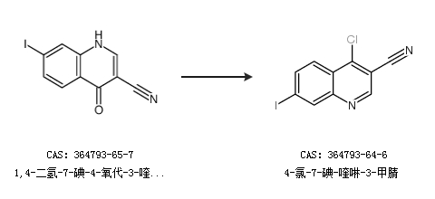 1.通过1,4-二氢-7-碘-4-氧代-3-喹啉甲腈合成4-氯-7-碘-喹啉-3-甲腈,收率约58%;