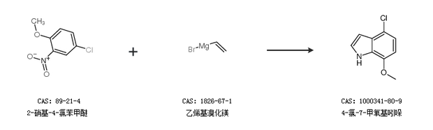 1.通过2-硝基-4-氯苯甲醚和乙烯基溴化镁合成4-氯-7-甲氧基吲哚