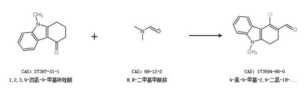 1.通过1,2,3,9-四氢-9-甲基咔唑酮和N,N-二甲基甲酰胺合成4-氯-9-甲基-2,9-二氢-1H-咔唑-3-甲醛