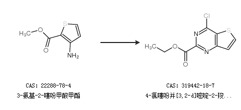 2.通过3-氨基-2-噻吩甲酸甲酯合成4-氯噻吩并[3,2-d]嘧啶-2-羧酸乙酯