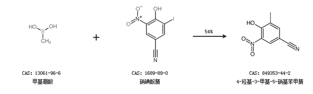 2.通过甲基硼酸和硝碘酚腈合成4-羟基-3-甲基-5-硝基苯甲腈,收率约54%;