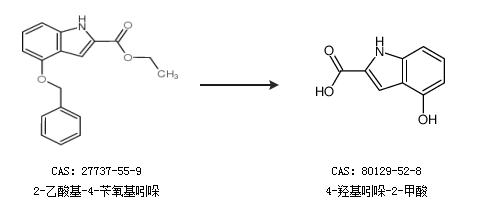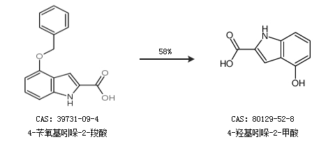 1.通过4-苄氧基吲哚-2-羧酸合成4-羟基吲哚-2-甲酸,收率约58%;