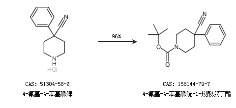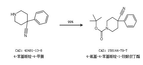 1.通过4-苯基哌啶-4-甲腈合成4-氰基-4-苯基哌啶-1-羧酸叔丁酯,收率约99%;