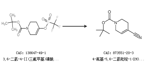 1.通过3,6-二氢-4-[[(三氟甲基)磺酰]氧基]-1(2H)-吡啶甲酸叔丁酯合成4-氰基-5,6-二氢吡啶-1(2H)-羧酸叔丁酯