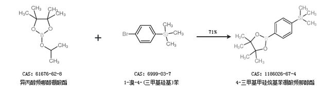 2.通过异丙醇频哪醇硼酸酯和1-溴-4-(三甲基硅基)苯合成4-三甲基甲硅烷基苯硼酸频那醇酯,收率约71%;
