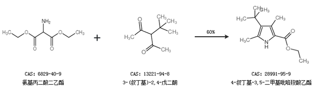 2.通过氨基丙二酸二乙酯和3-(叔丁基)-2,4-戊二酮合成4-叔丁基-3,5-二甲基吡咯羧酸乙酯,收率约60%;