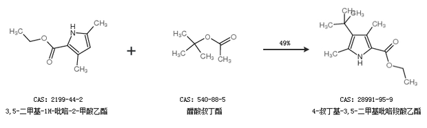 1.通过3,5-二甲基-1H-吡咯-2-甲酸乙酯和醋酸叔丁酯合成4-叔丁基-3,5-二甲基吡咯羧酸乙酯,收率约49%;