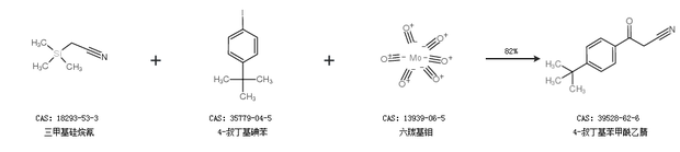 2.通过三甲基硅烷氰、4-叔丁基碘苯和六羰基钼合成4-叔丁基苯甲酰乙腈,收率约82%;