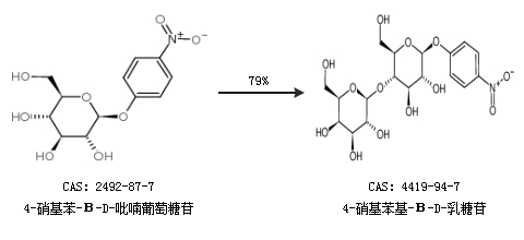 1.通过4-硝基苯-Β-D-吡喃葡萄糖苷合成4-硝基苯基-Β-D-乳糖苷,收率约79%;