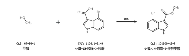 2.通过甲醇和4-溴-1H-吲哚-3-羧酸合成4-溴-1H-吲哚-3-羧酸甲酯,收率约10%;