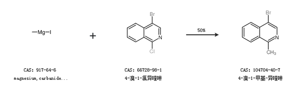 1.通过magnesium,carbanide,iodide和4-溴-1-氯异喹啉合成4-溴-1-甲基-异喹啉,收率约50%;