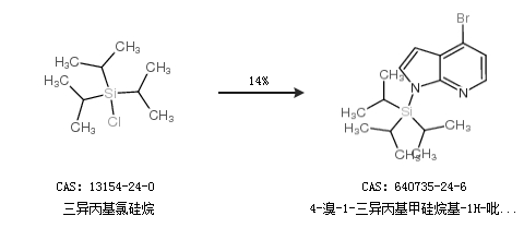 2.通过三异丙基氯硅烷合成4-溴-1-三异丙基甲硅烷基-1H-吡咯并[2,3-b]吡啶,收率约14%;