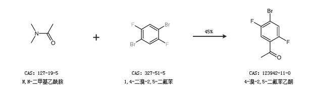 1.通过N,N-二甲基乙酰胺和1,4-二溴-2,5-二氟苯合成4-溴-2,5-二氟苯乙酮,收率约45%;