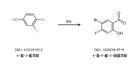 1.通过4-溴-3-氟苯酚合成4-溴-5-氟-2-硝基苯酚,收率约45%;