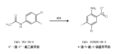 1.通过4’-溴-3’-氟乙酰苯胺合成4-溴-5-氟-2-硝基苯甲胺,收率约45%;