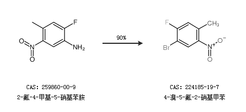 1.通过2-氟-4-甲基-5-硝基苯胺合成4-溴-5-氟-2-硝基甲苯,收率约90%;