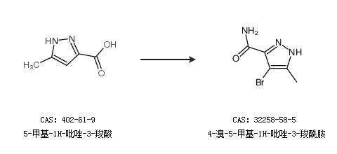 1.通过5-甲基-1H-吡唑-3-羧酸合成4-溴-5-甲基-1H-吡唑-3-羧酰胺
