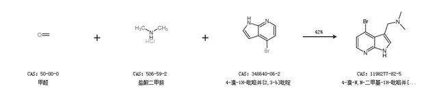 1.通过甲醛、盐酸二甲胺和4-溴-1H-吡咯并[2,3-b]吡啶合成4-溴-N,N-二甲基-1H-吡咯并[2,3-B]吡啶-3-甲胺,收率约42%;