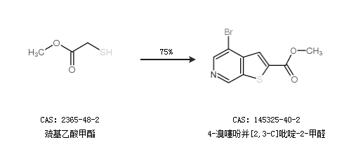 2.通过巯基乙酸甲酯合成4-溴噻吩并[2,3-C]吡啶-2-甲醛,收率约75%;