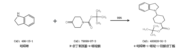 1.通过吲哚啉和N-叔丁氧羰基-4-哌啶酮合成4-吲哚啉-1-哌啶-1-羧酸叔丁酯,收率约99%;